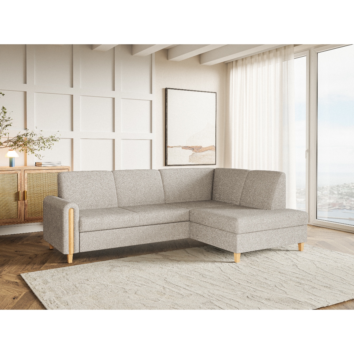 Beżowy narożnik FLORYDA, prawostronny to elegancki i funkcjonalny mebel w kształcie litery L, oferujący wysoki komfort dzięki siedzisku z pianki HR i sprężyn falistych, praktyczną funkcję spania z mechanizmem delfin, pojemnik na pościel oraz stylowe wykończenie drewnianymi listwami i nóżkami w trzech odcieniach, co czyni go idealnym wyborem do nowoczesnego salonu.