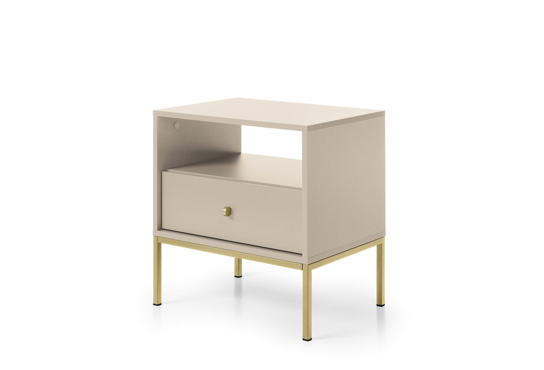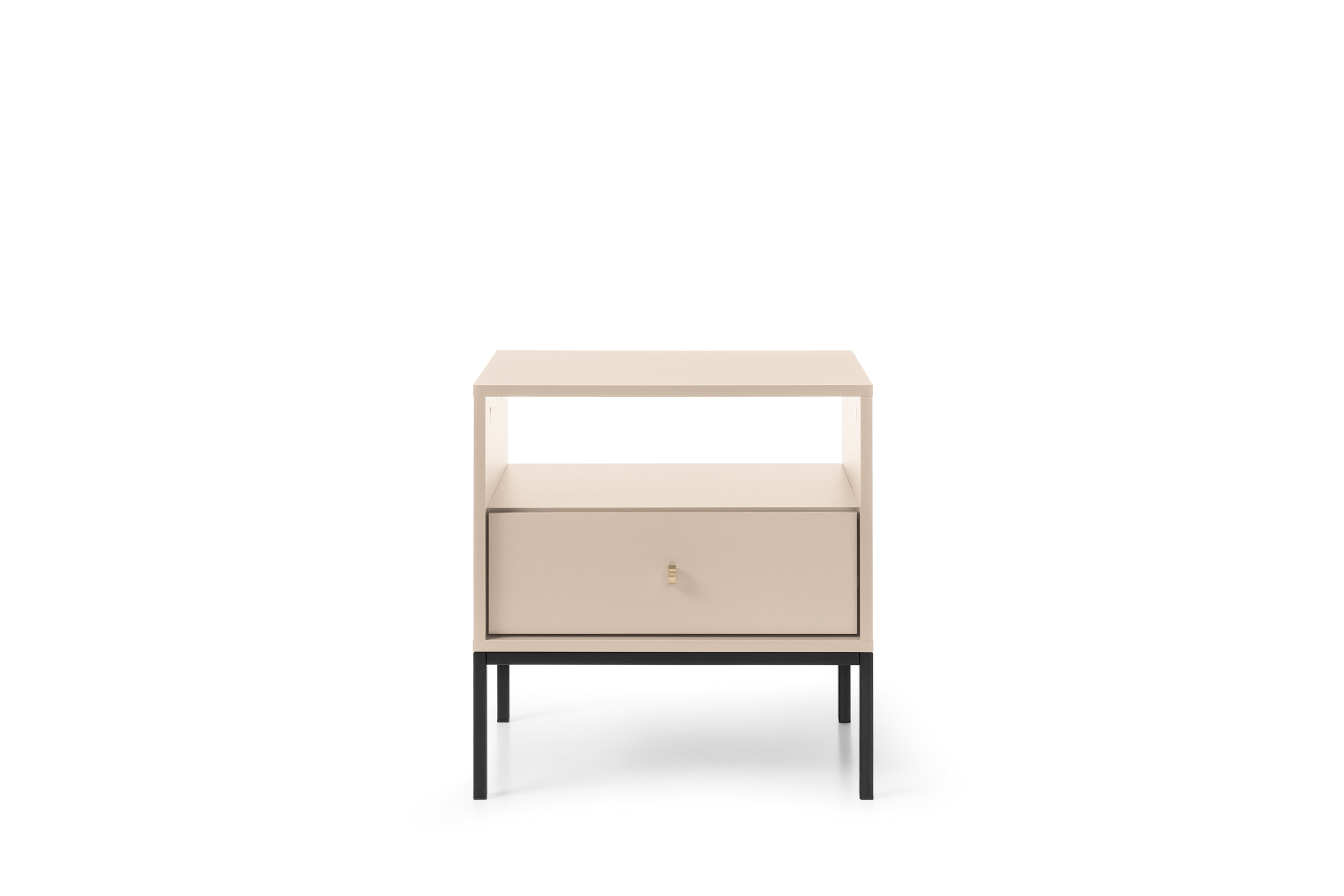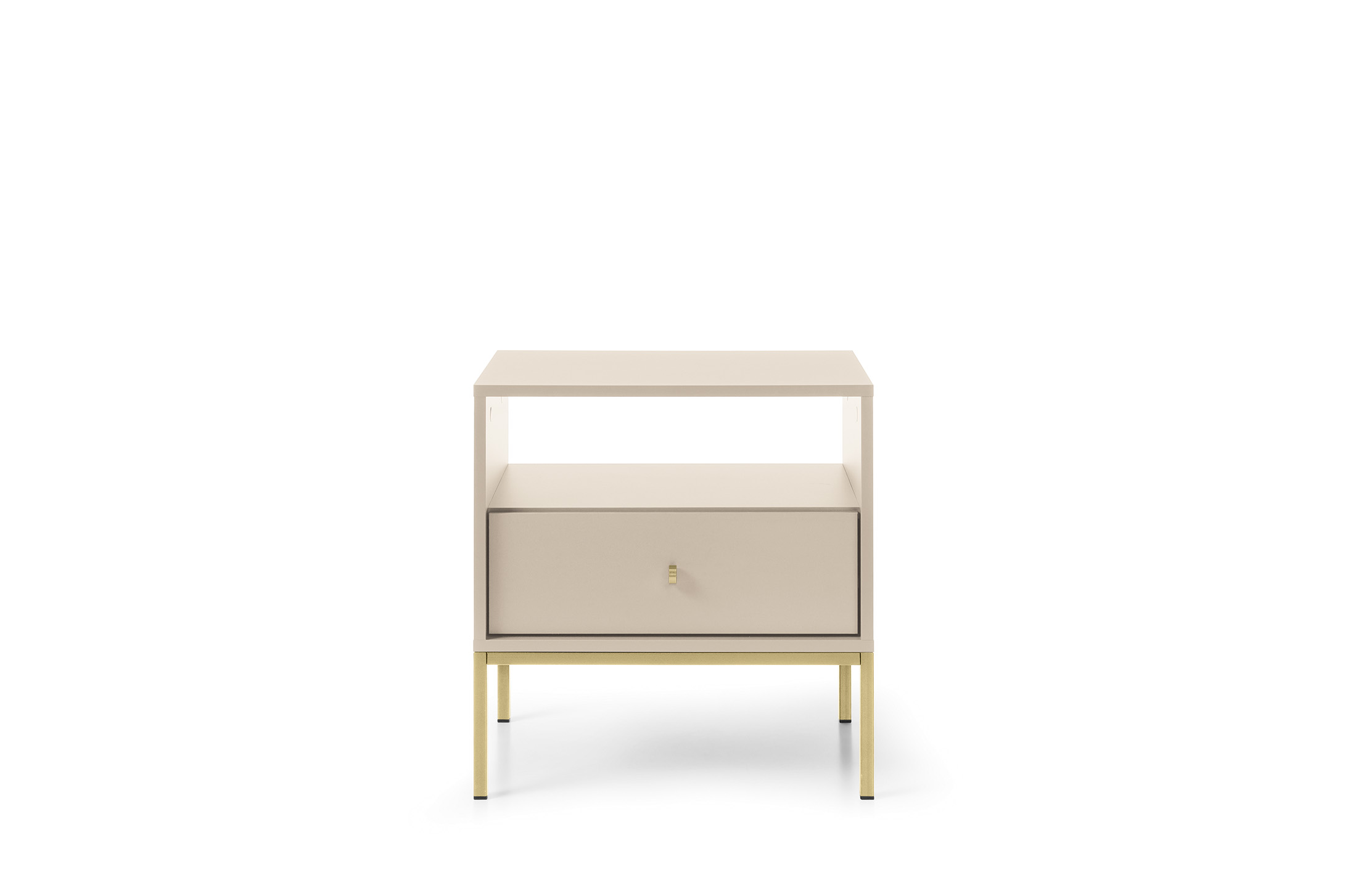 Beżowy stolik nocny MONO w odcieniu beż piaskowy to praktyczny i stylowy mebel, który wnosi do wnętrza spokój i przytulność. Jasny, neutralny odcień beżu doskonale komponuje się z różnorodnymi aranżacjami, od nowoczesnych po skandynawskie i klasyczne, a złote detale oraz możliwość wyboru ramy w kolorze czarnym lub złotym pozwalają dopasować stolik do indywidualnego stylu. Doskonale współgra z jasnymi ścianami, naturalnymi dodatkami i tekstyliami, tworząc przytulną, harmonijną przestrzeń. Mebel może pełnić funkcję klasycznej szafki nocnej lub praktycznego stolika pomocniczego.