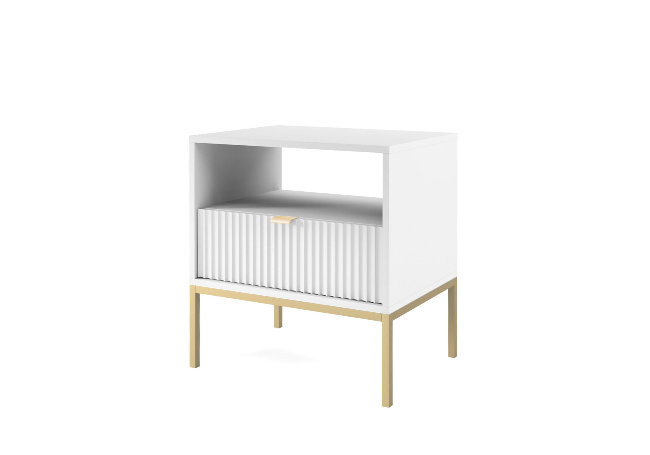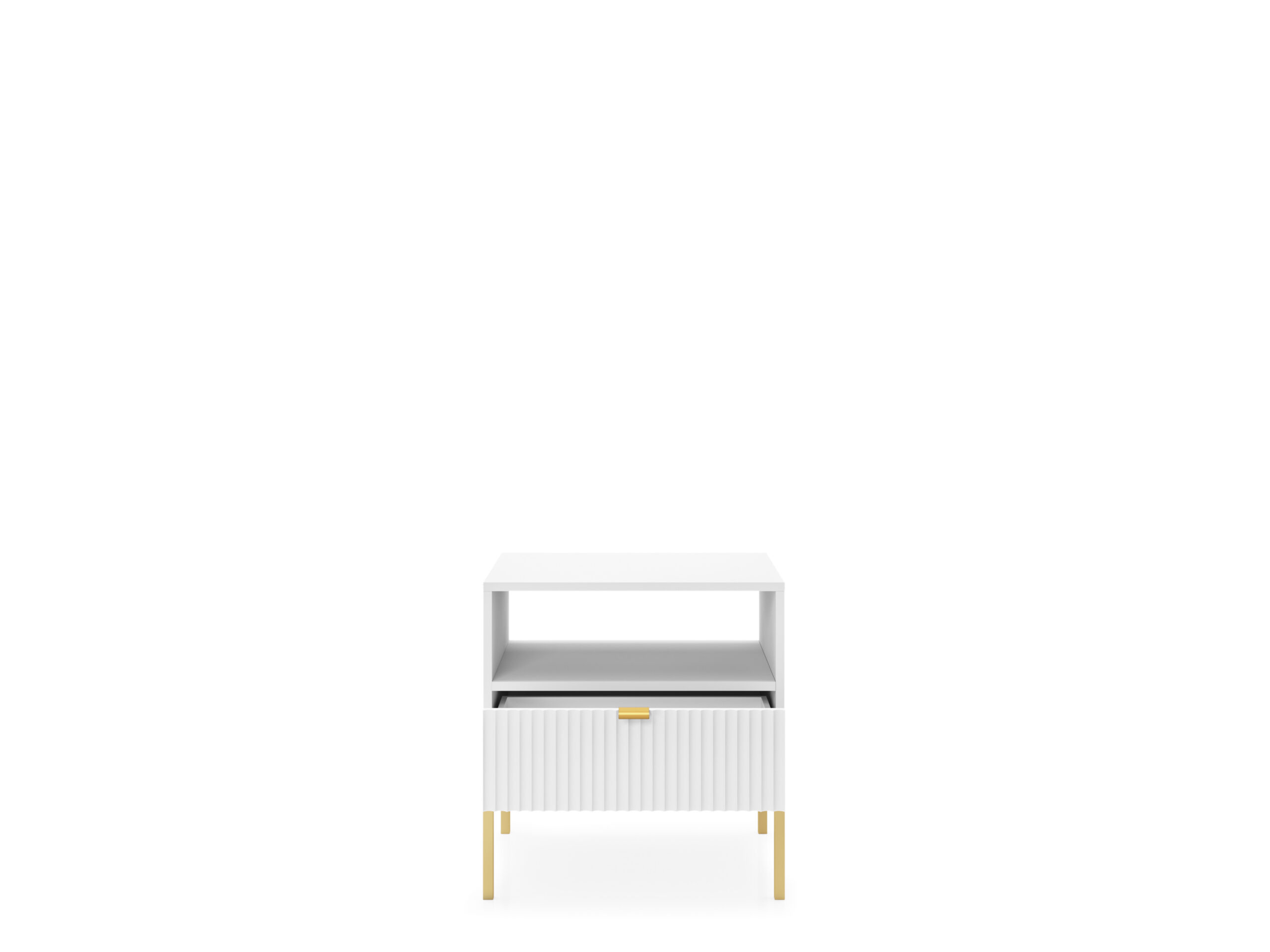 Biały stolik nocny Nova to idealne dopełnienie sypialni w nowoczesnym stylu. Dzięki uniwersalnemu wykończeniu mebel świetnie wpisuje się zarówno w aranżacje minimalistyczne, jak i eleganckie wnętrza glamour. Subtelna barwa bieli w połączeniu z ryflowanym frontem szuflady oraz elegancką ramą w kolorze złotym lub czarnym tworzy ponadczasową kompozycję, która doda charakteru każdej sypialni.