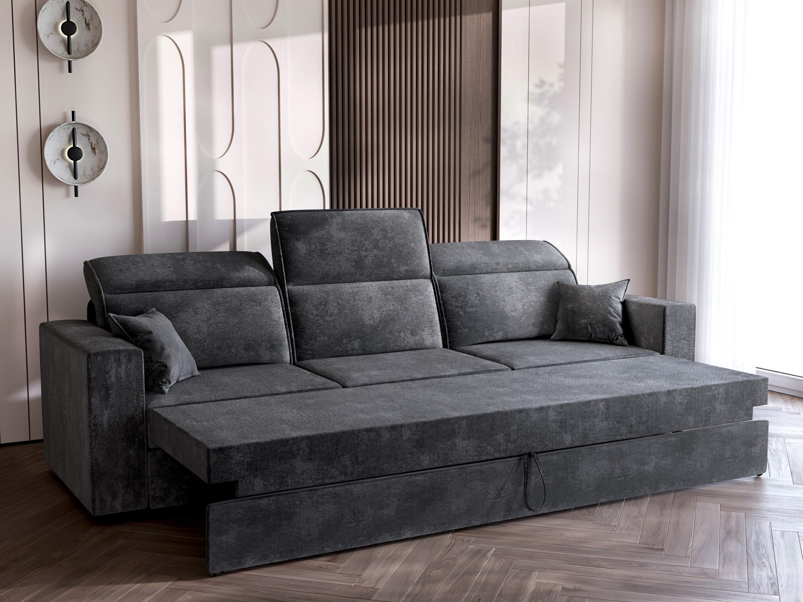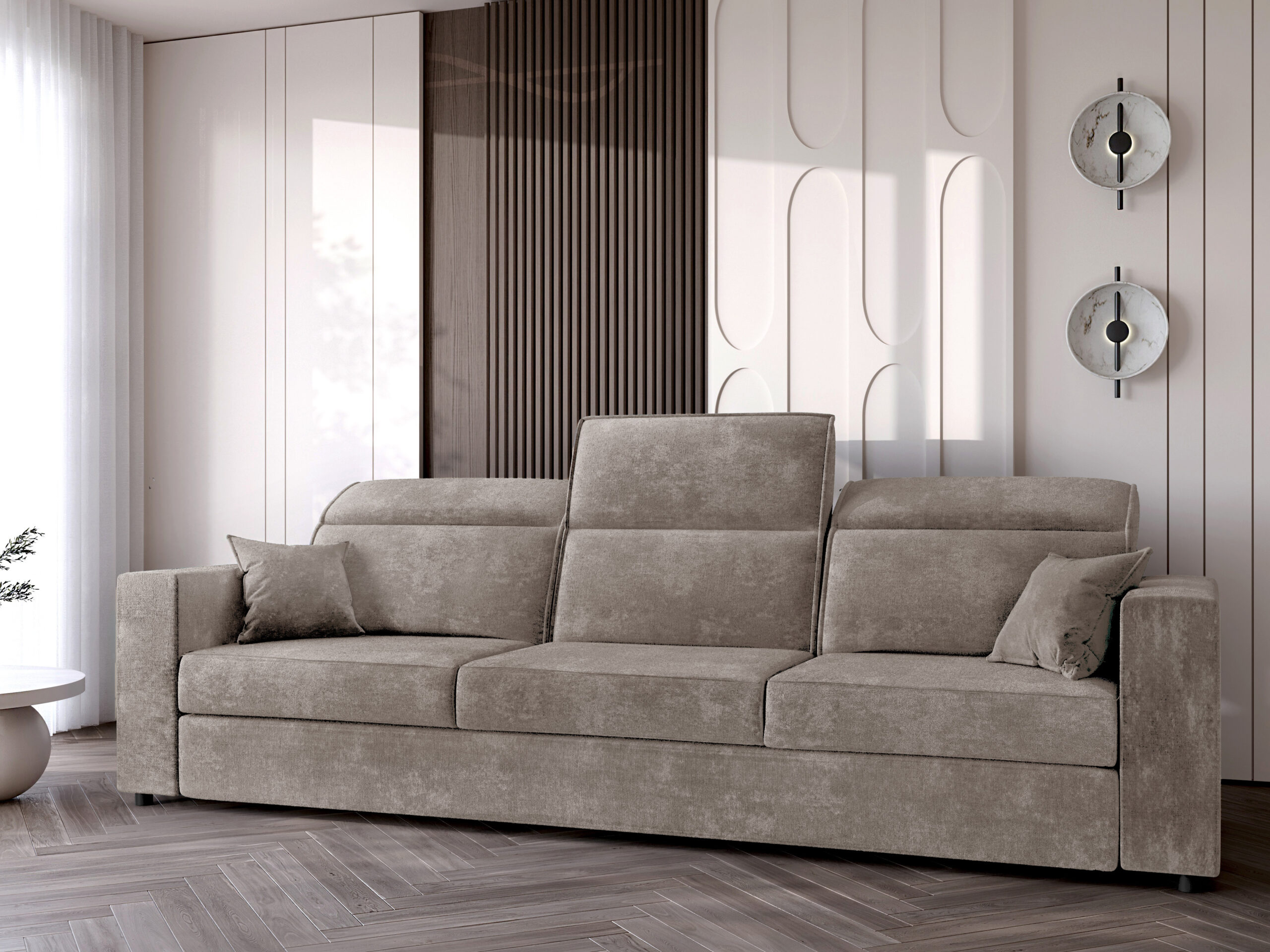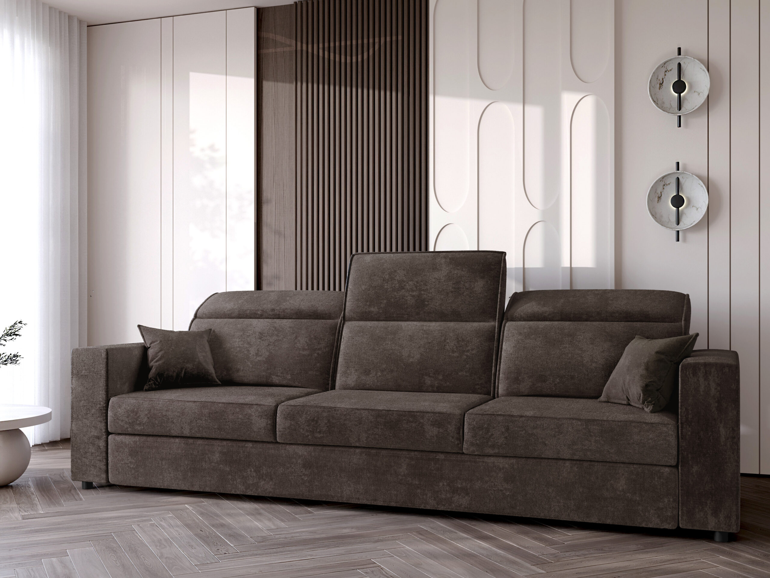 Kanapa z pufą i regulowanymi zagłówkami wyposażona jest w 3 zagłówki, które umożliwiają dopasowanie oparcia do indywidualnych potrzeb – idealne do relaksu, czytania czy oglądania telewizji. Komfort użytkowania zapewnia siedzisko wykonane z pianki T28 oraz sprężyn falistych, co gwarantuje odpowiednie podparcie, trwałość i odporność na odkształcenia. Sofa ARMANI posiada również funkcję spania, dzięki której w szybki i prosty sposób można uzyskać wygodną powierzchnię do nocnego wypoczynku dla domowników lub gości.