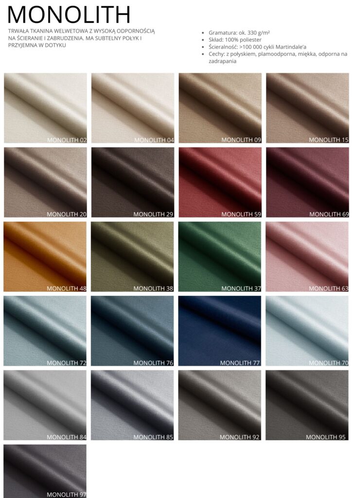 • Materiał obicia: welur (Monolith, Magic Velvet, Kronos)