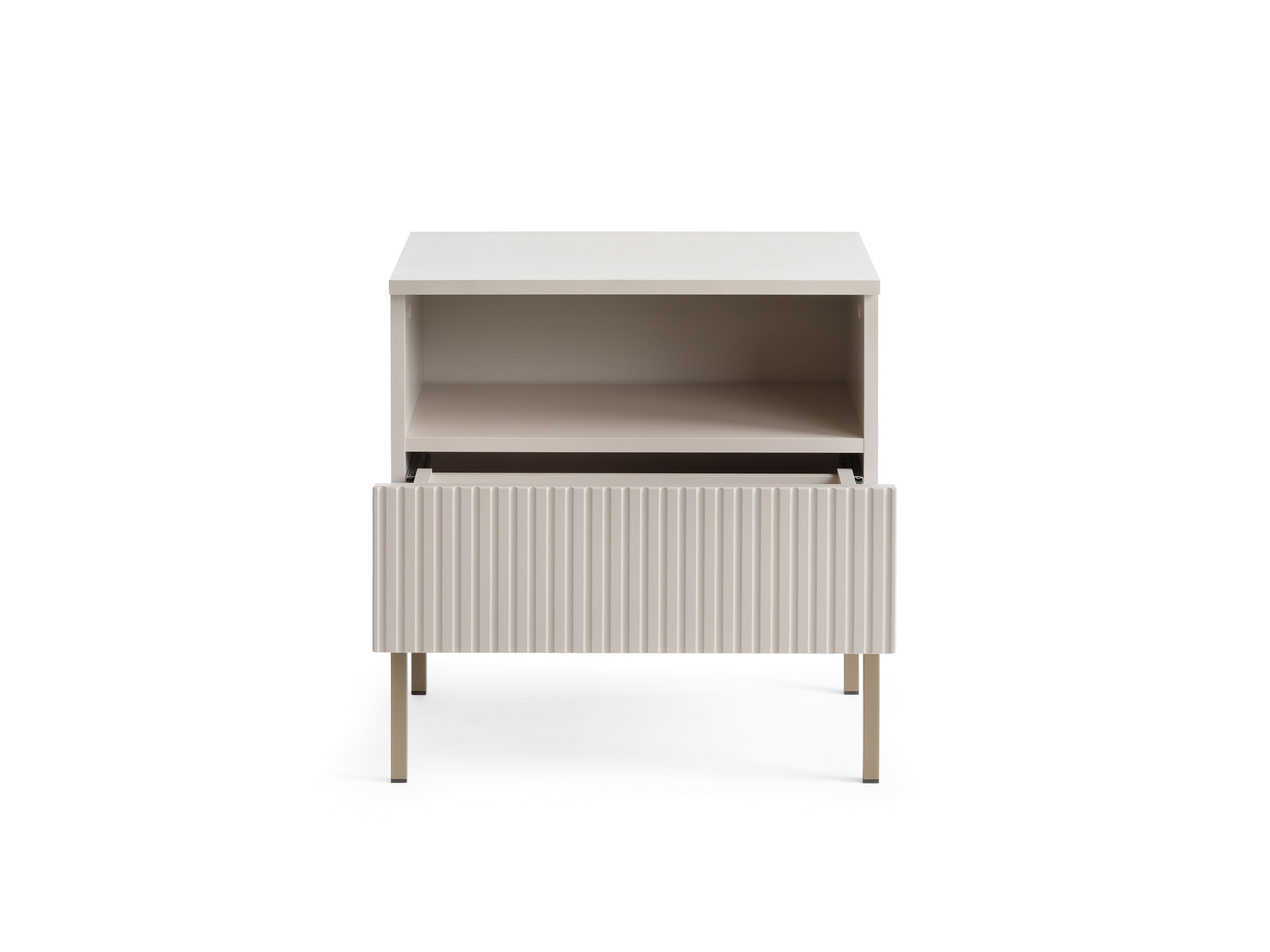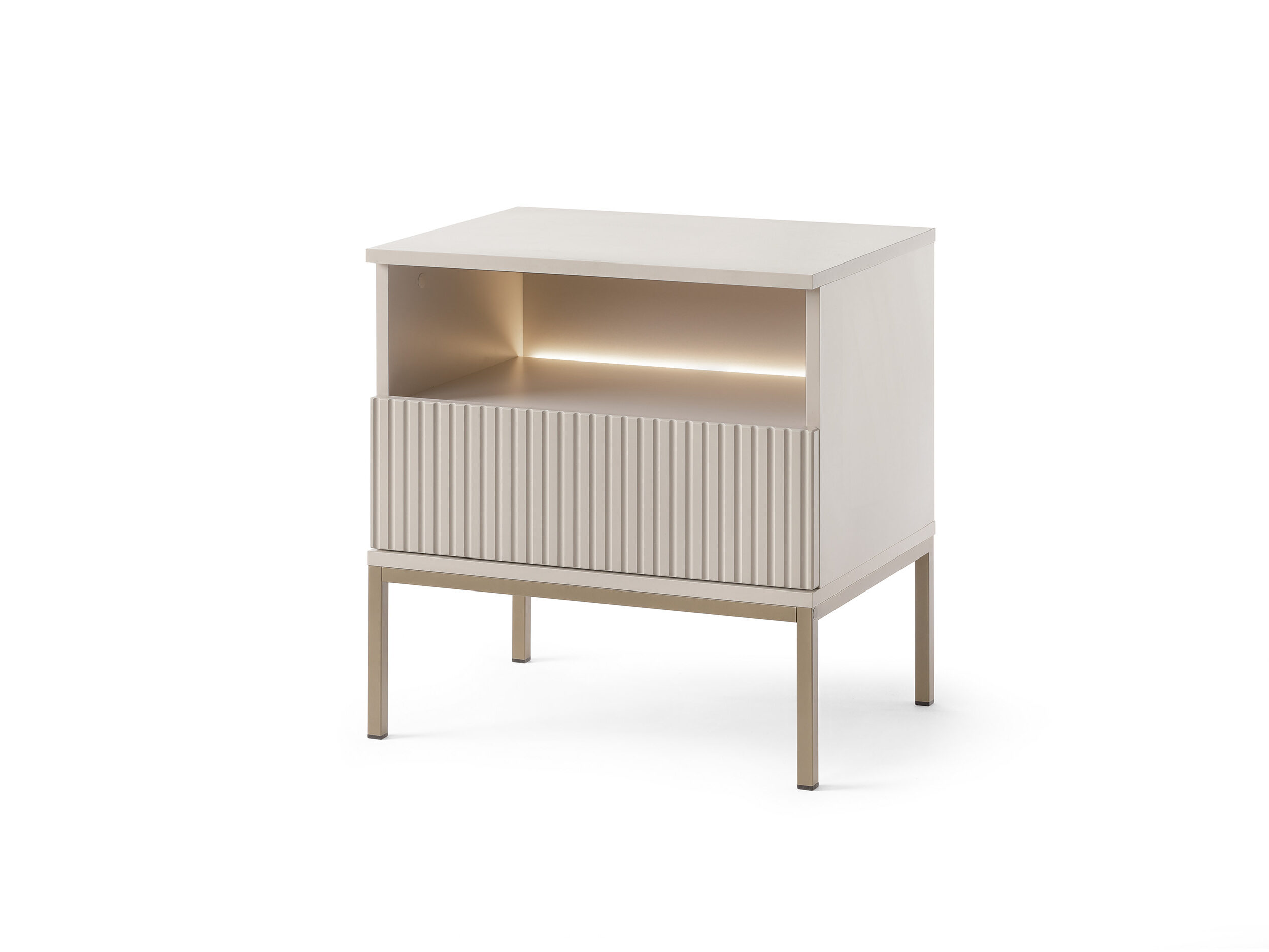 Kaszmirowy stolik nocny z kolekcji Sento to propozycja dla osób ceniących połączenie subtelnej elegancji i nowoczesnego designu. Jasny, stonowany kolor nadaje wnętrzu przytulności, a ryflowany front szuflady wzbogacony o dyskretne oświetlenie LED dodaje całości wyjątkowego charakteru. To mebel, który świetnie odnajdzie się w sypialni, pokoju młodzieżowym czy salonie, wprowadzając do aranżacji nutę stylu i harmonii.