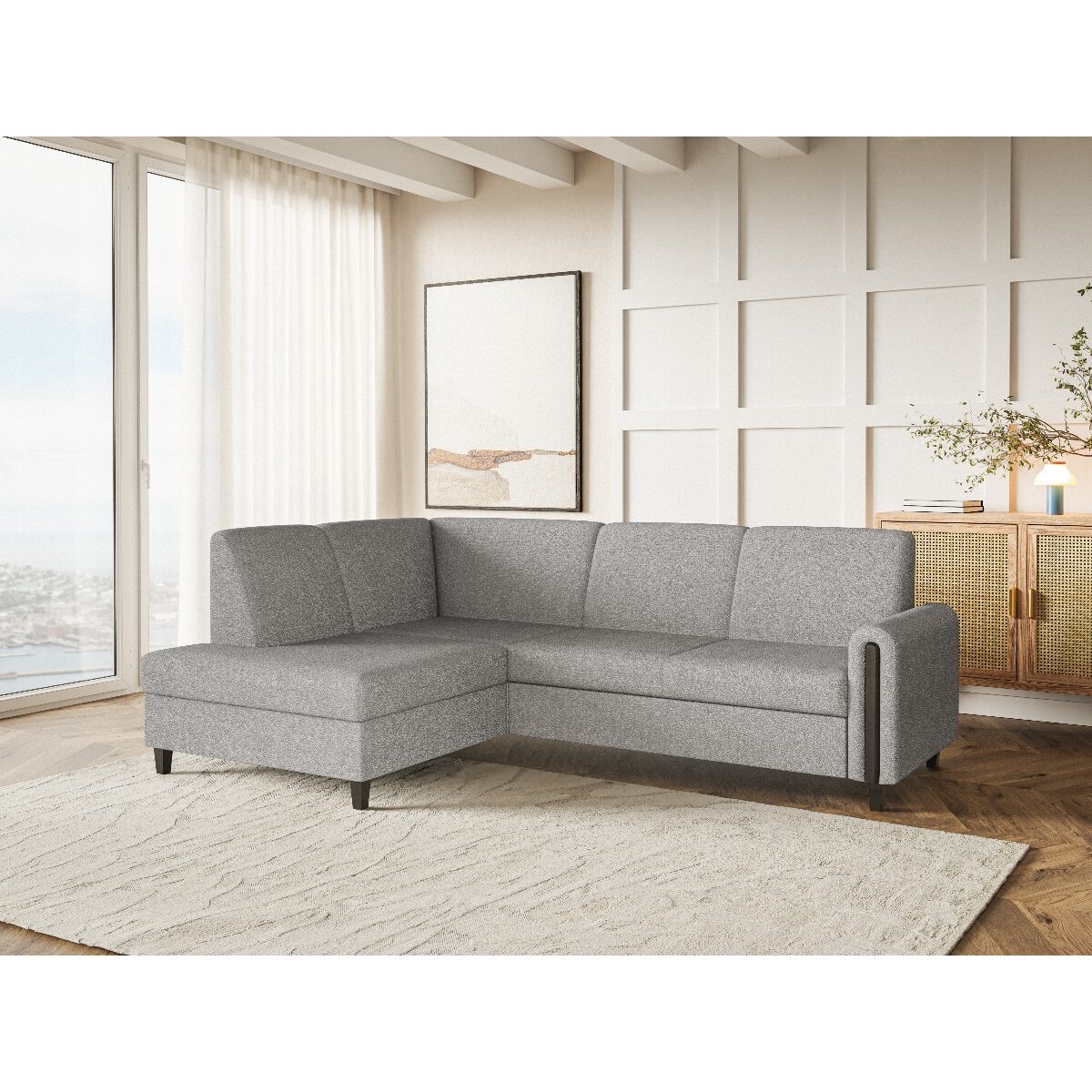 Szary narożnik FLORYDA, lewostronny to elegancki i funkcjonalny mebel w kształcie litery L, oferujący wysoki komfort dzięki siedzisku z pianki HR i sprężyn falistych, praktyczną funkcję spania z mechanizmem delfin, pojemnik na pościel oraz stylowe wykończenie drewnianymi listwami i nóżkami w trzech odcieniach, co czyni go idealnym wyborem do nowoczesnego salonu.