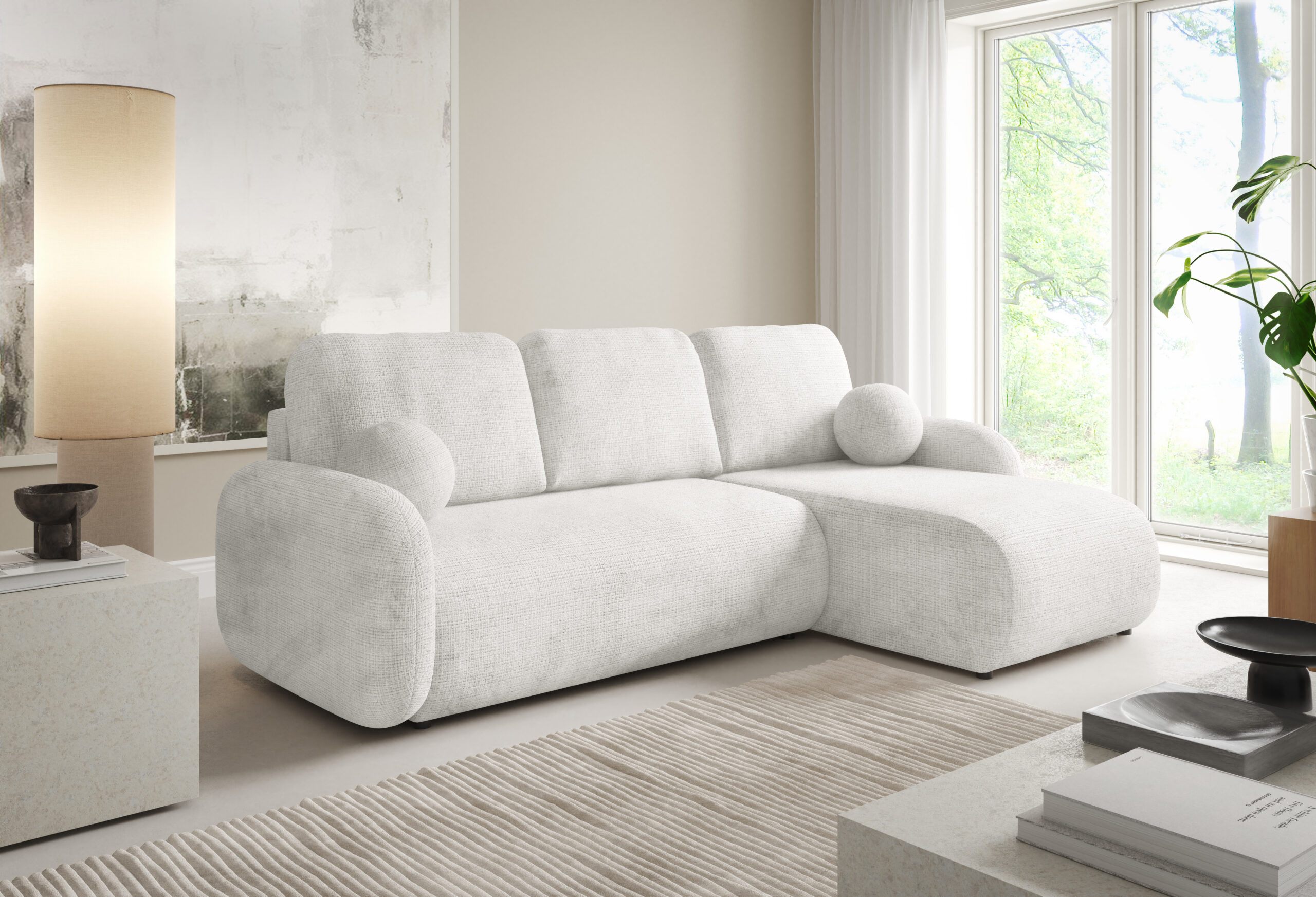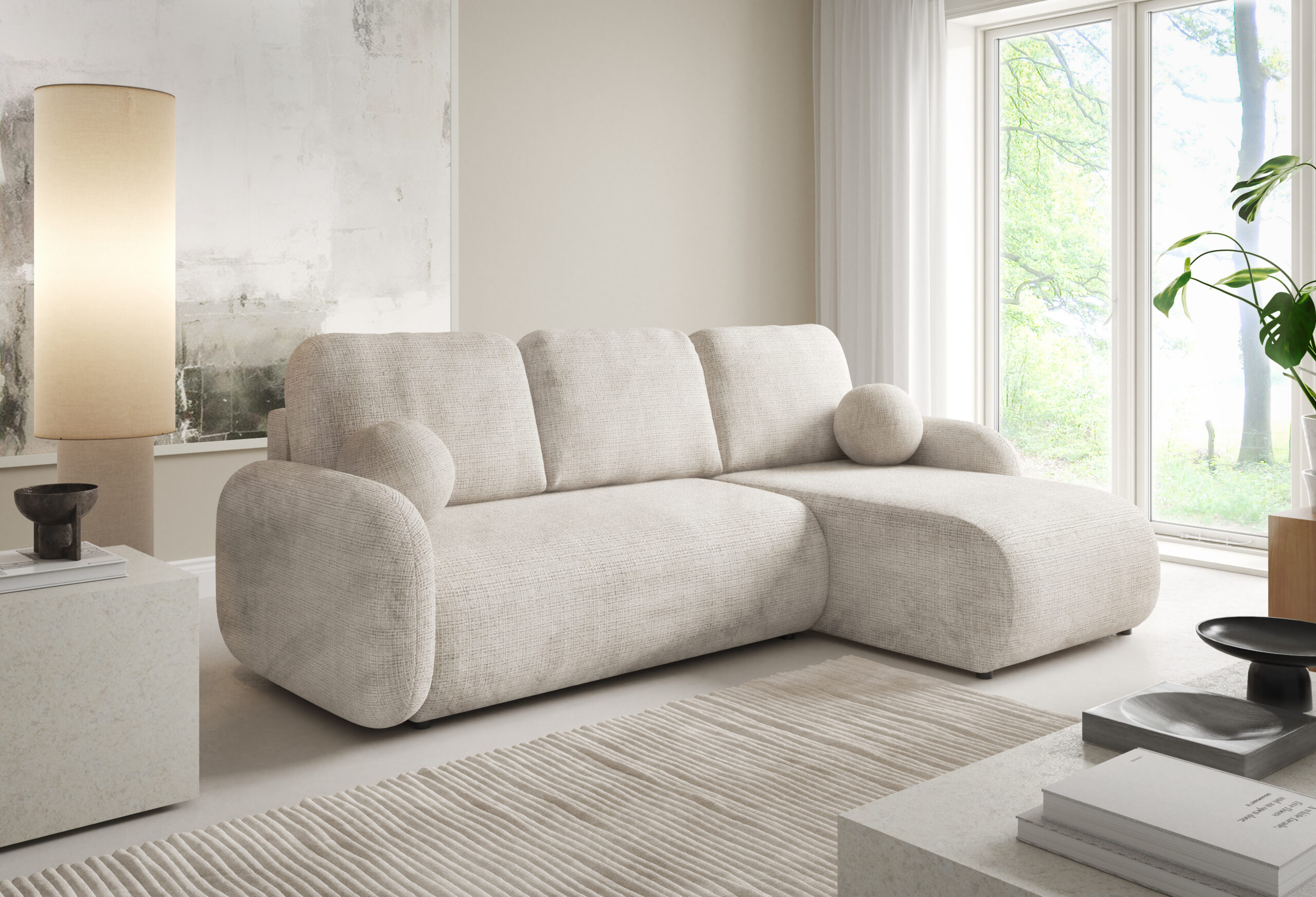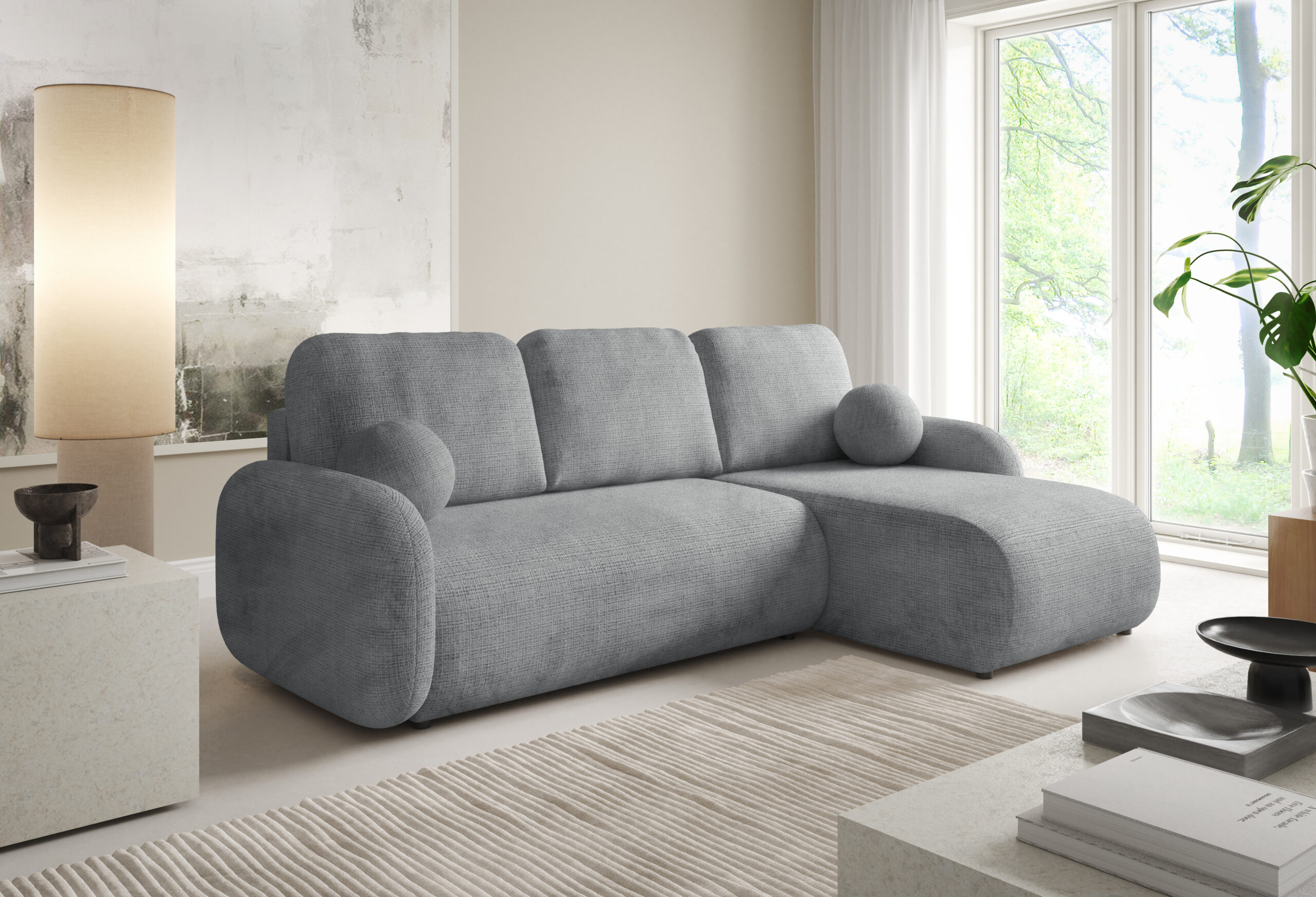 Narożnik rozkładany z pojemnikiem to doskonałe połączenie nowoczesnego designu, wygody i funkcjonalności. Jego miękka, zaokrąglona forma oraz harmonijne proporcje sprawiają, że świetnie odnajdzie się zarówno w nowoczesnych, jak i bardziej klasycznych aranżacjach wnętrz. Duże poduszki oparciowe oraz komfortowe siedzisko zapewniają wyjątkową wygodę. Dodatkowego uroku całości nadają eleganckie, okrągłe poduszki dekoracyjne, które podkreślają przytulny charakter mebla.