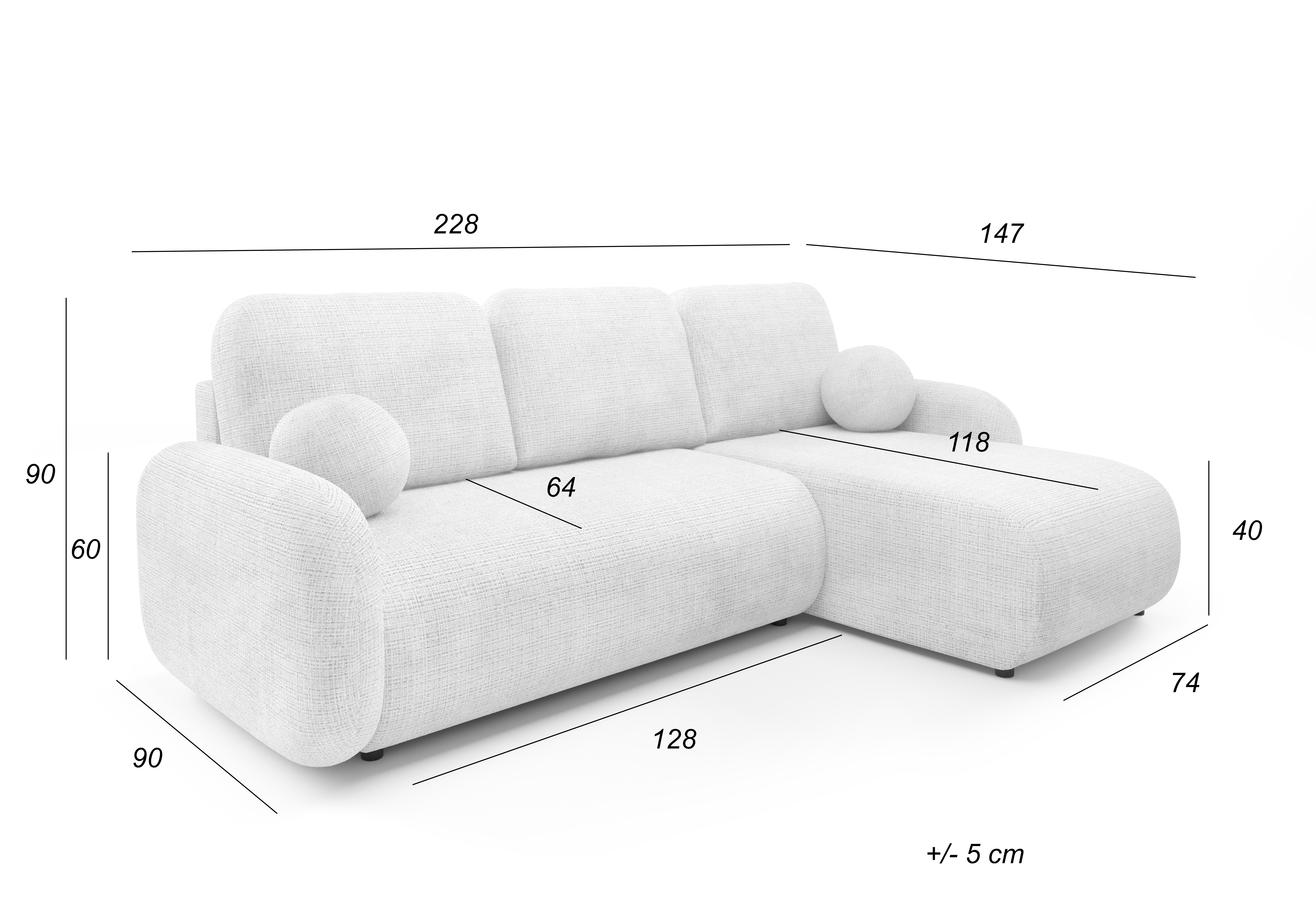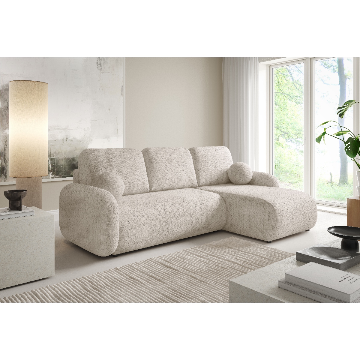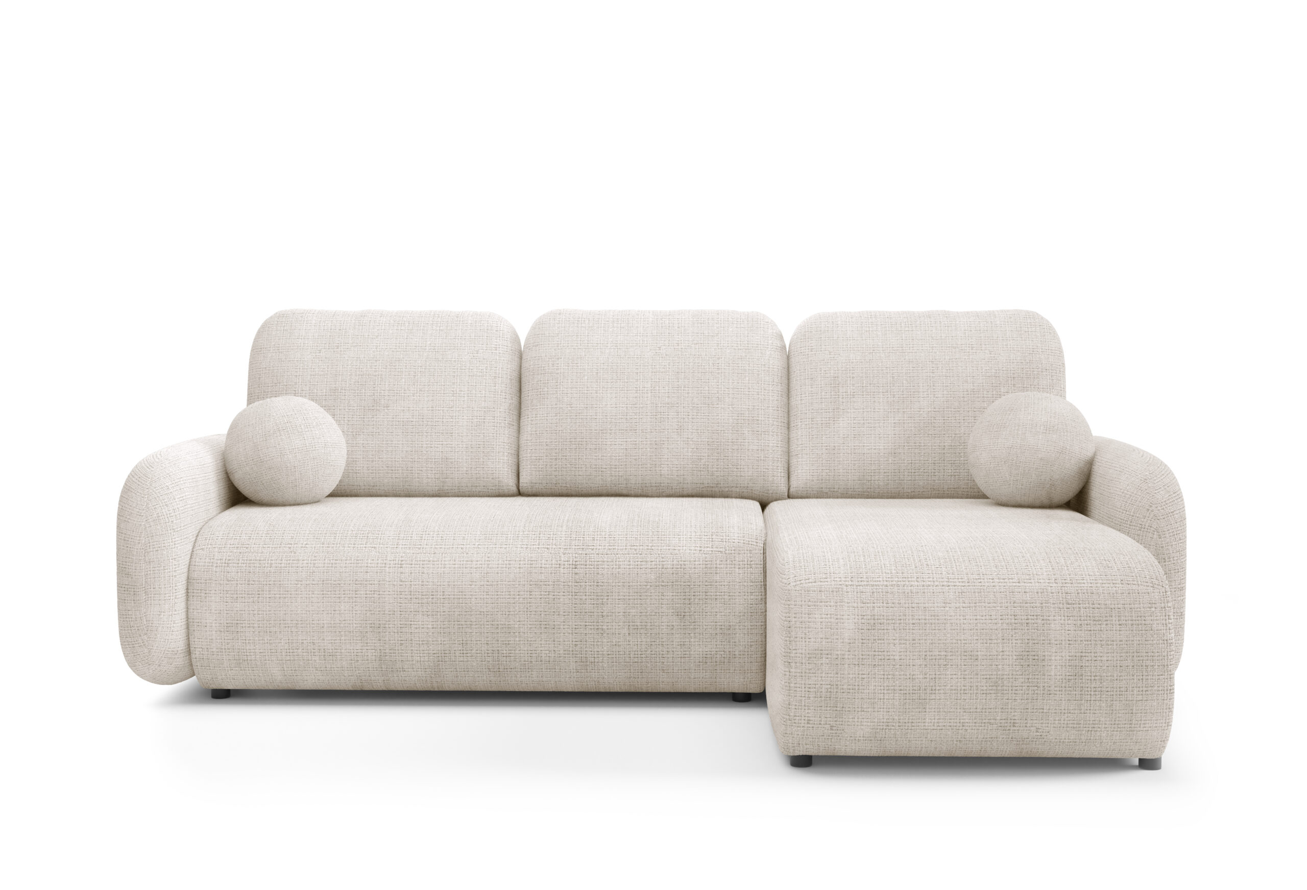 Narożnik rozkładany z pojemnikiem to doskonałe połączenie nowoczesnego designu, wygody i funkcjonalności. Jego miękka, zaokrąglona forma oraz harmonijne proporcje sprawiają, że świetnie odnajdzie się zarówno w nowoczesnych, jak i bardziej klasycznych aranżacjach wnętrz. Duże poduszki oparciowe oraz komfortowe siedzisko zapewniają wyjątkową wygodę. Dodatkowego uroku całości nadają eleganckie, okrągłe poduszki dekoracyjne, które podkreślają przytulny charakter mebla.