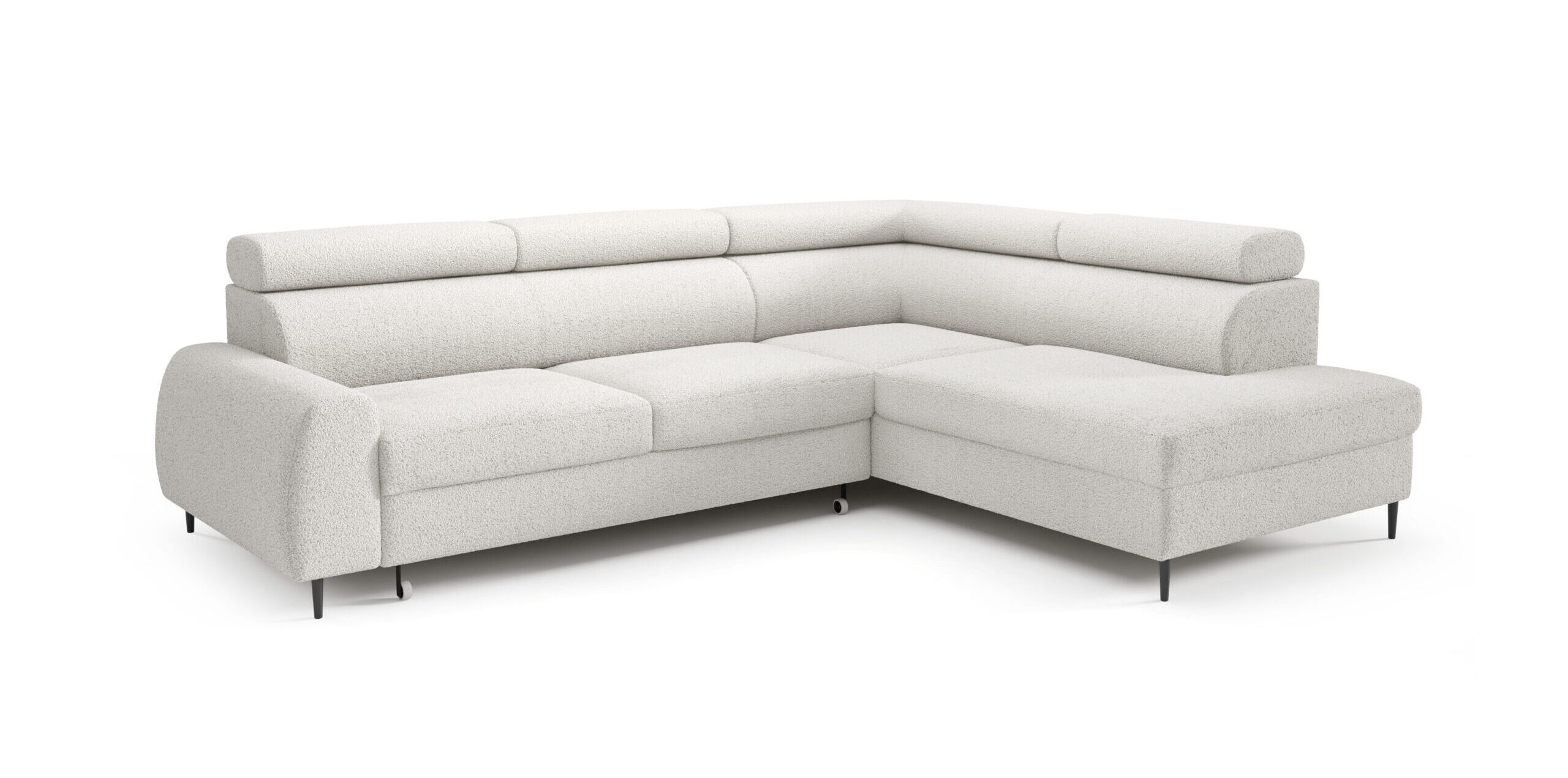 Narożnik rozkładany z regulowanymi zagłówkami to doskonała propozycja dla osób, które cenią sobie połączenie estetyki, funkcjonalności i komfortu użytkowania. Dzięki przemyślanej konstrukcji oraz nowoczesnemu wyglądowi, mebel ten idealnie wpasuje się w przestrzeń salonu, pokoju dziennego lub gościnnego. Zastosowanie sprężyny falistej i pianki T25/28 zapewnia wygodne siedzisko, które nie odkształca się z czasem i pozwala na komfortowy wypoczynek każdego dnia. Narożnik świetnie sprawdza się również jako miejsce do spania – łatwo rozkładany system umożliwia szybkie przekształcenie mebla w wygodne łóżko o powierzchni 120×196 cm. Praktyczny pojemnik na pościel ułatwia przechowywanie koców, kołder czy poduszek, dzięki czemu salon zawsze wygląda schludnie.