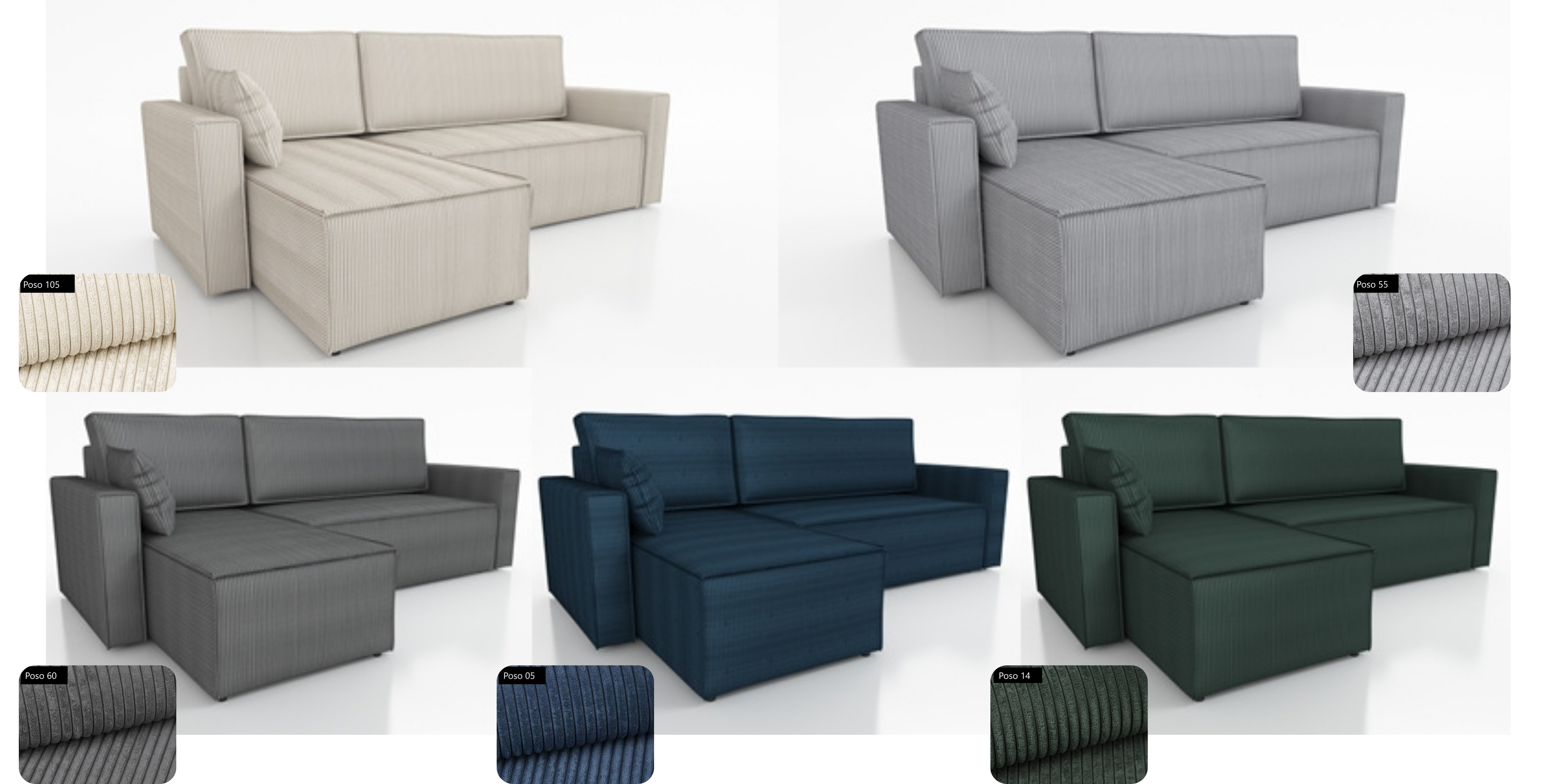 • Miękka, stylowa tkanina sztruksowa – przyjemna w dotyku i dostępna w pięciu modnych kolorach, idealnie wpasowuje się w nowoczesne aranżacje.