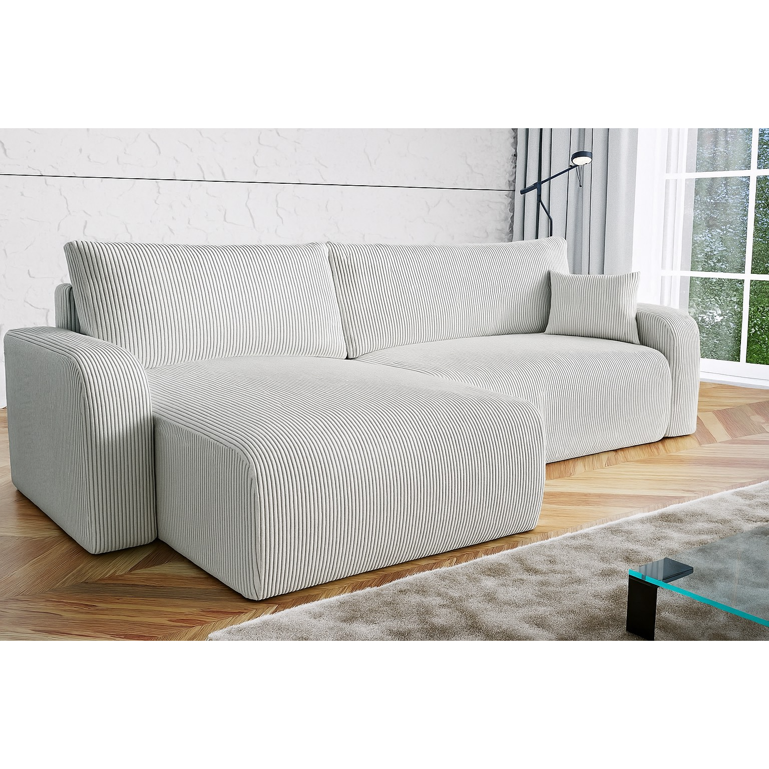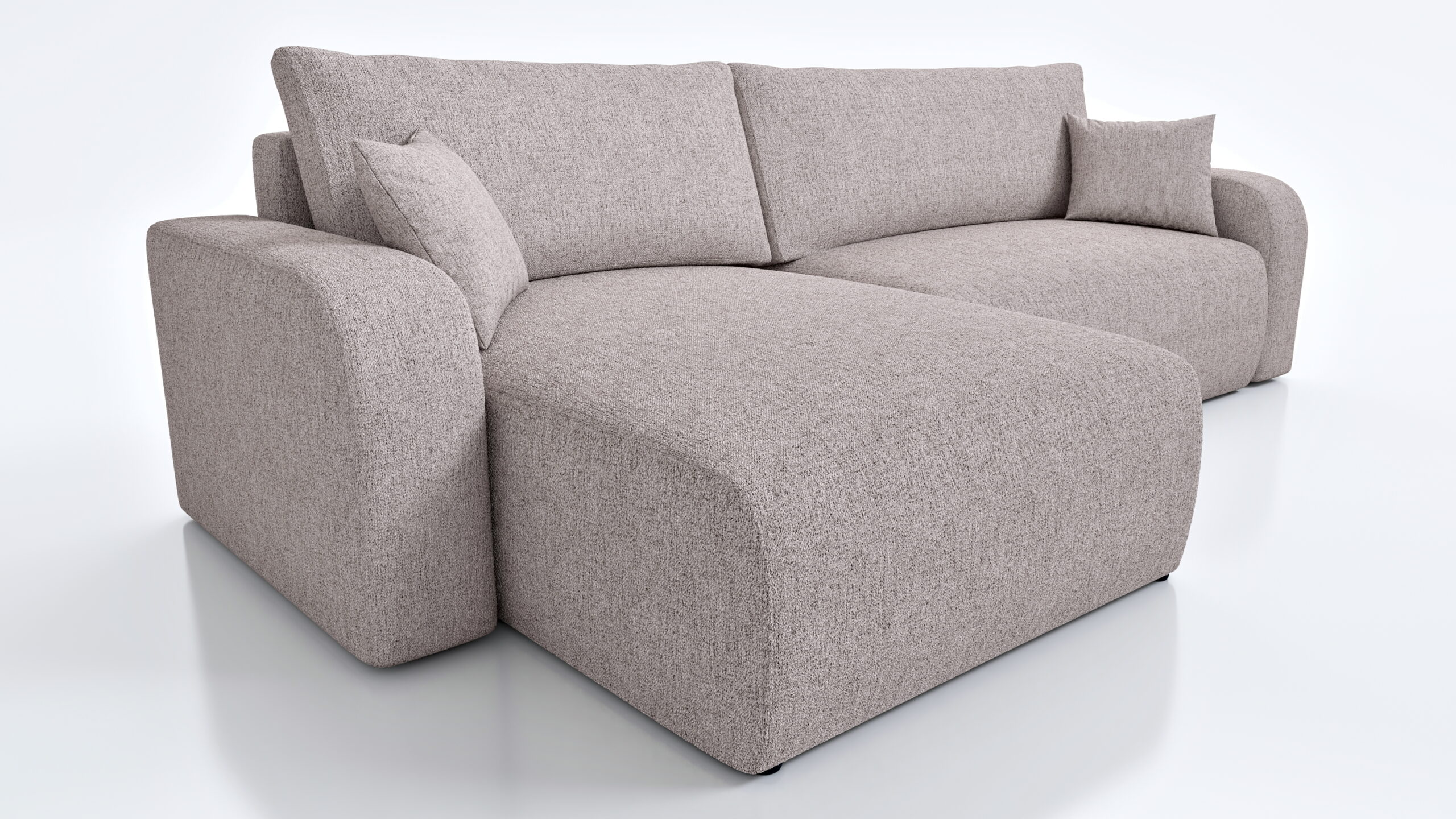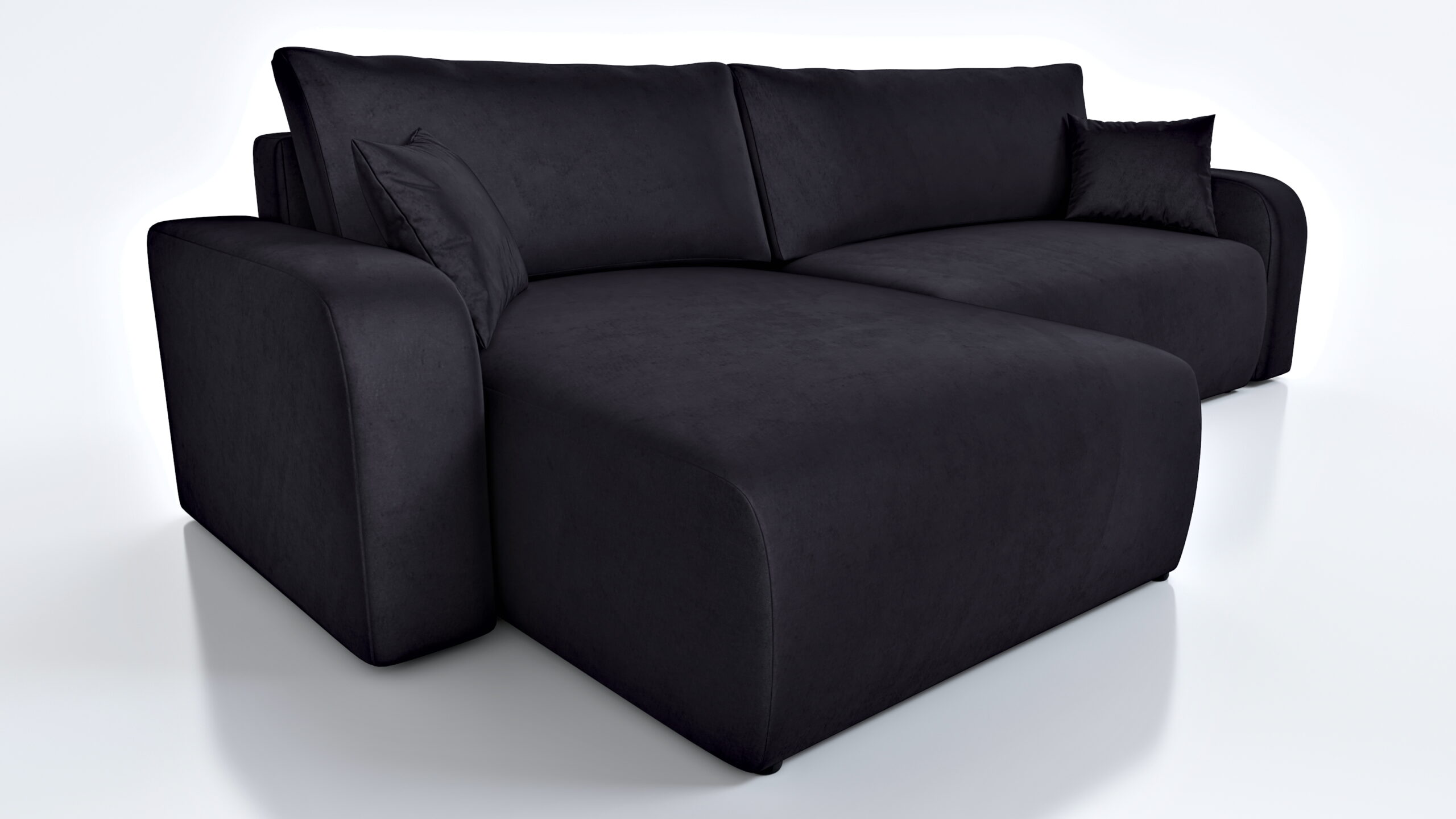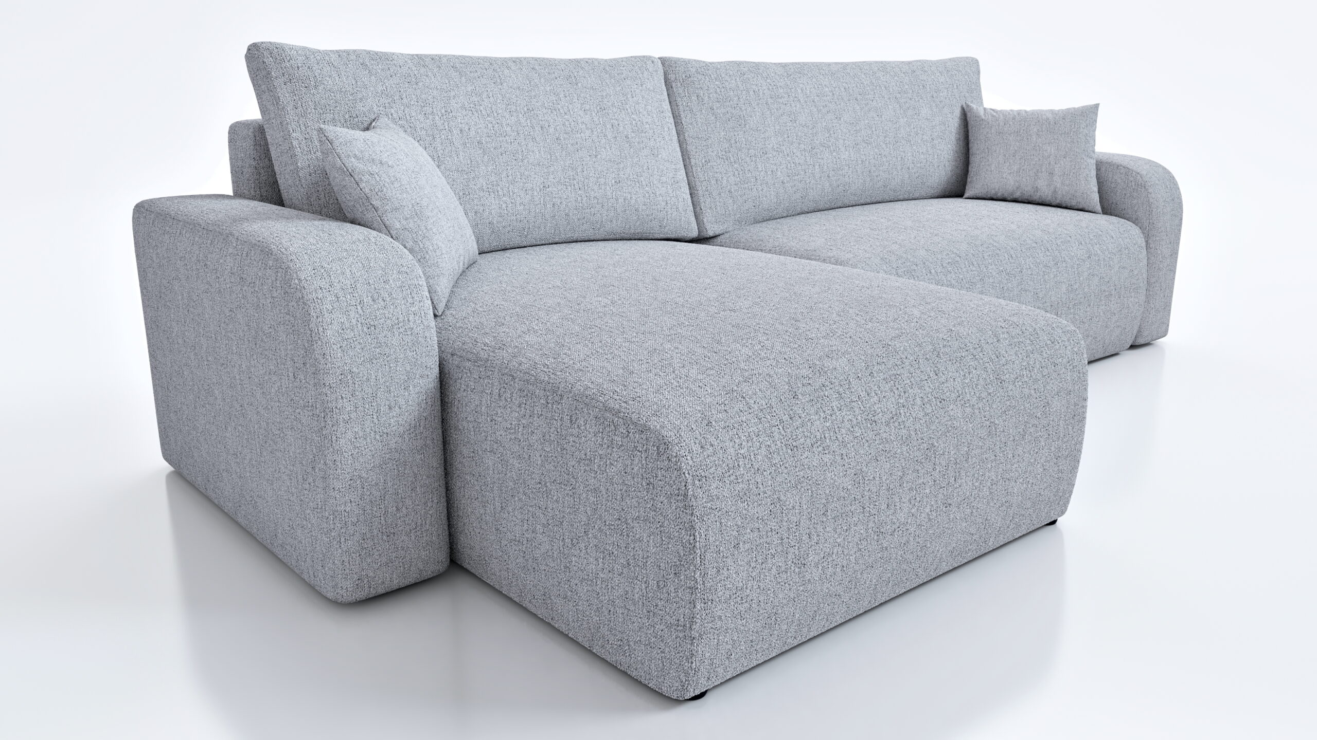 — Narożnik o nowoczesnym kształcie z funkcją spania i pojemnikiem na pościel —