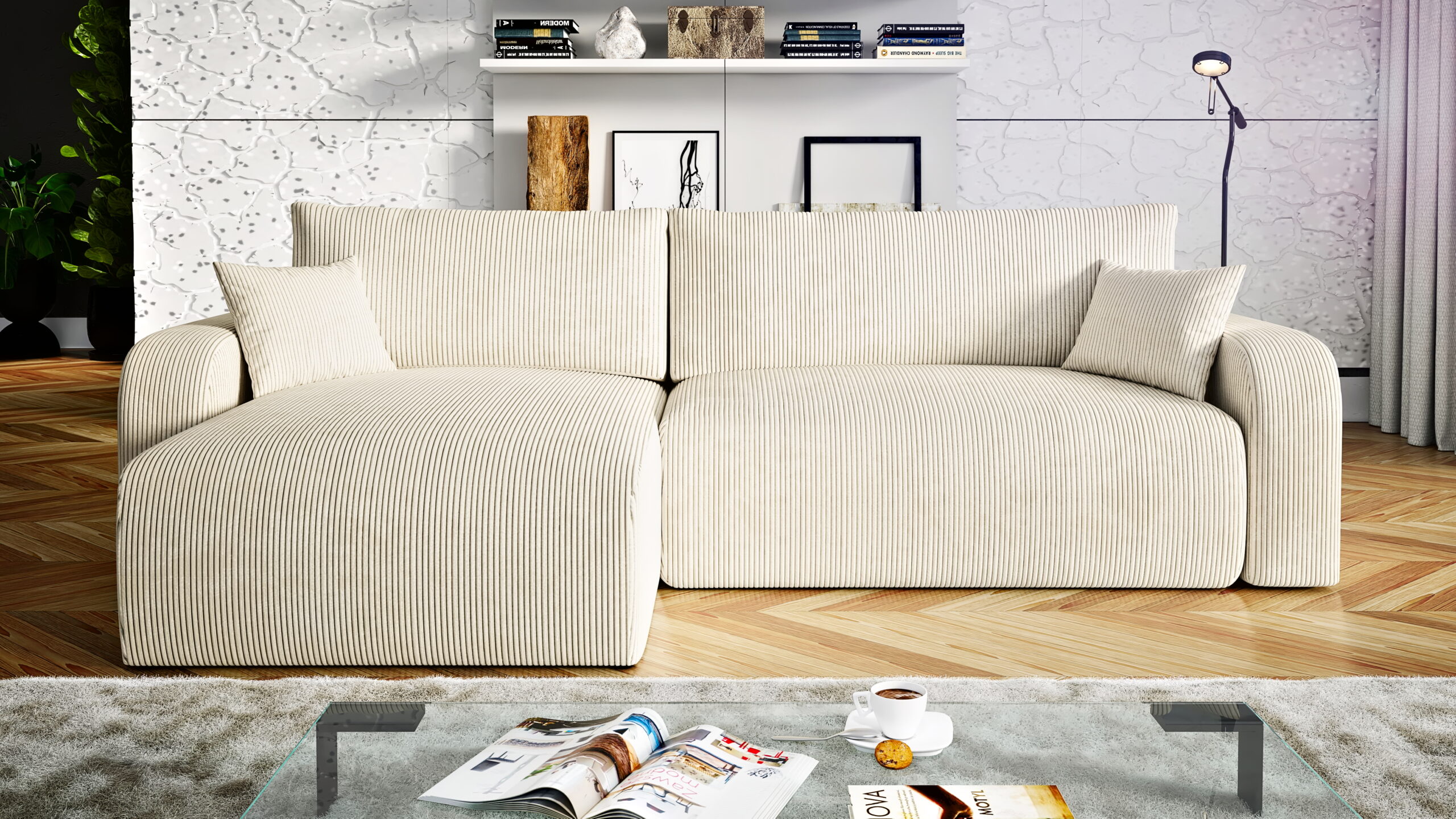 Narożnik tapicerowany z funkcją spania HAVANA L to największy model z kolekcji — idealne połączenie elegancji, komfortu i praktyczności. Jego miękka linia, nowoczesna forma oraz tkanina o strukturze sztruksu (dostępna w różnych kolorach) sprawiają, że doskonale komponuje się z wnętrzami w stylu współczesnym i skandynawskim.