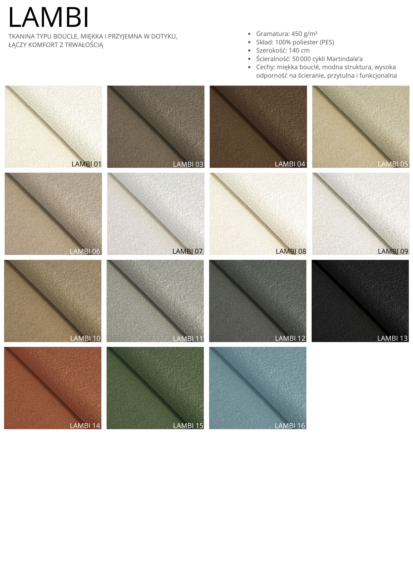 Próbki tkanin prezentowane poniżej mają charakter poglądowy. Kolory mogą się nieznacznie różnić w rzeczywistości ze względu na ustawienia ekranu, oświetlenie oraz partie produkcyjne. Wybierając tkaninę, należy podać jej nazwę lub numer w odpowiedniej rubryce podczas składania zamówienia.