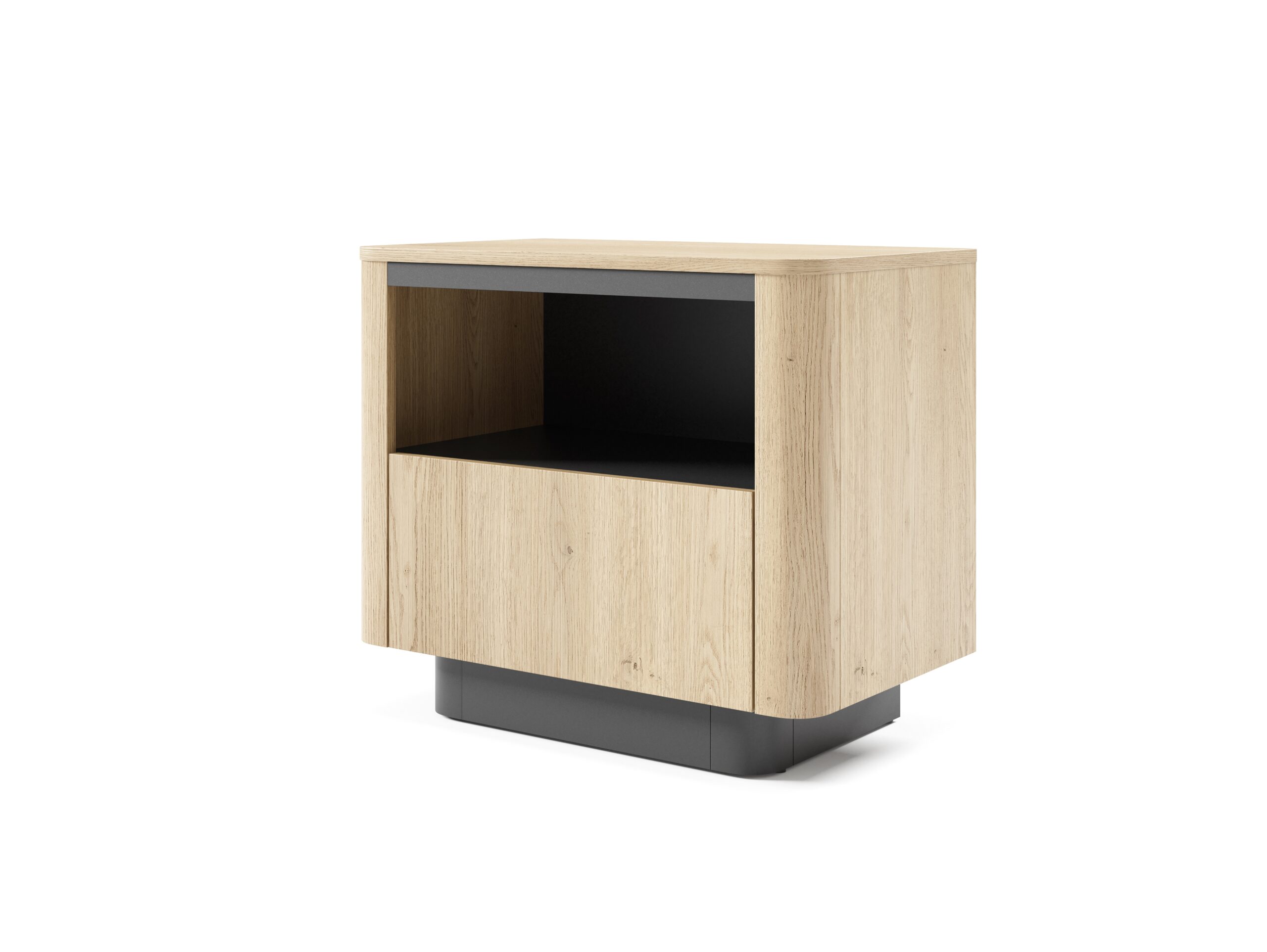 — Stolik nocny Torro w dekorze dąb cremona z czarnymi detalami – nowoczesny i funkcjonalny —