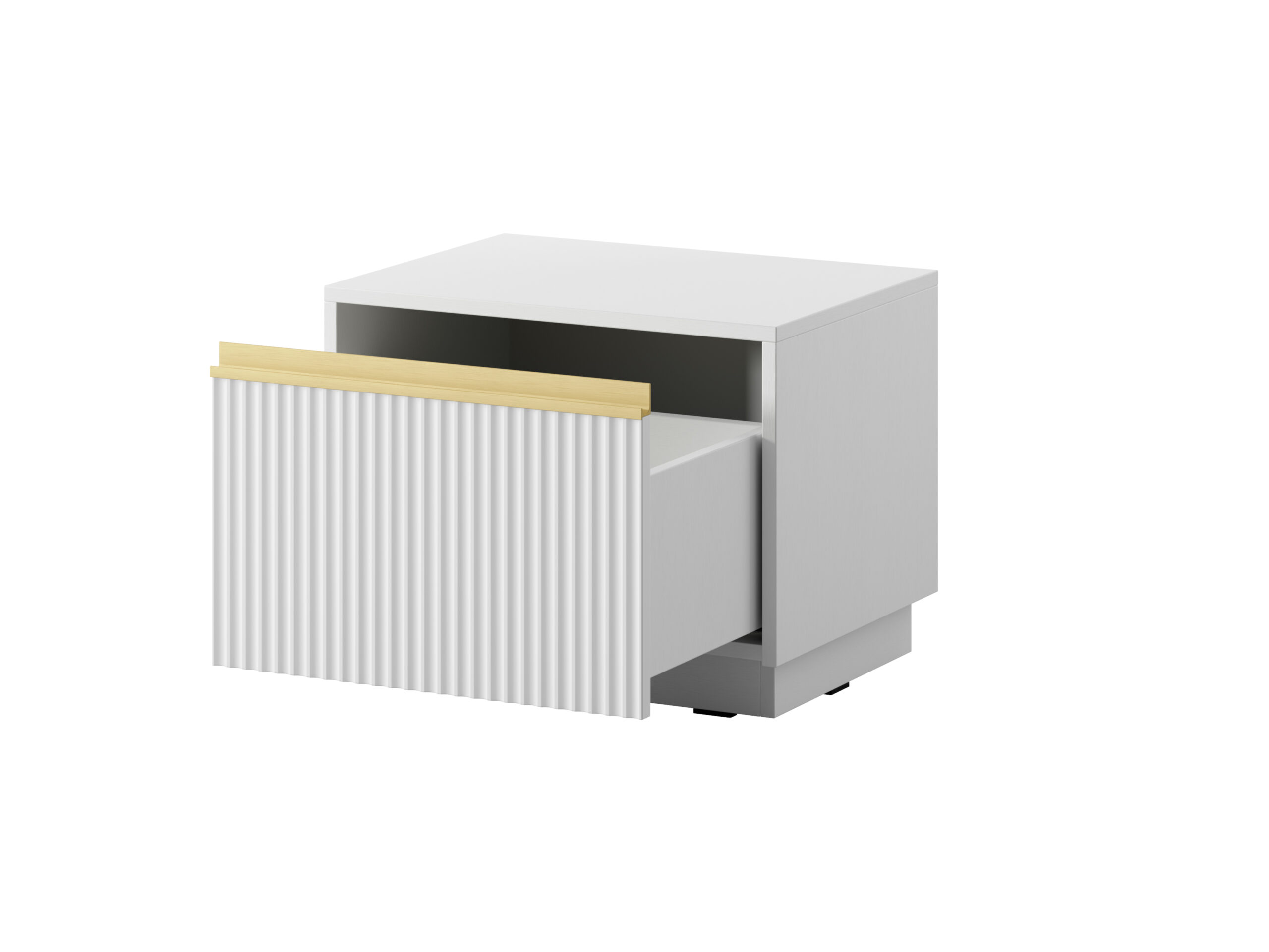Szafka nocna biała z kolekcji Royal to mebel, który łączy minimalistyczną formę z wyrafinowaną elegancją. Minimalistyczna forma została urozmaicona ryflowanym frontem oraz subtelnym uchwytem w odcieniu szczotkowanego złota, który dodaje całości wyjątkowego charakteru. Jasny kolor optycznie powiększa przestrzeń i doskonale komponuje się zarówno z wnętrzami w stylu nowoczesnym, jak i glamour.
